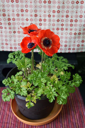 (左下)「パンドラダブル」は長寿でまだ元気です。その代わり他のアネモネは同時に複数花咲くのに比べ大きな一輪の花を咲かせる様子