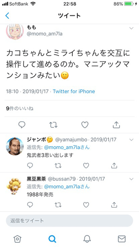 HAC-P-AM7LA」からTwitterのIDを取得し、専用アカウントを開設するほど楽しみに。ログインボーナス7日目を貰うとセーブデータが破損し公式アカウントから直接原因を聞かれ謝罪される様子をクソゲースレが偶然発見する。その後、何度バグで制作中のデータを消されても怒ること無く「
