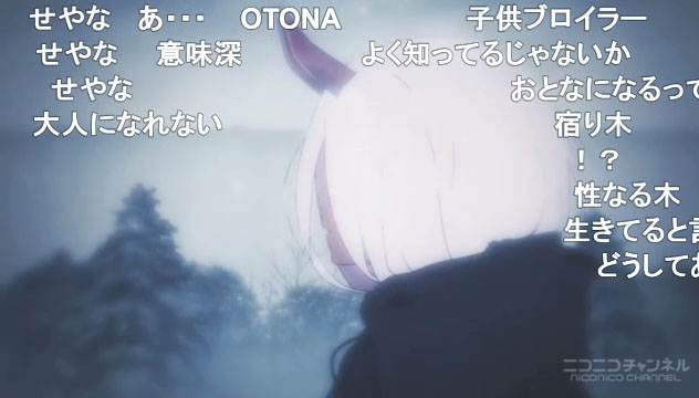 □ 第10話 永遠の街 「ダーリン・イン・ザ・フランキス」10話上映会 http://live.nicovideo.jp/watch/lv310454857 今までは生放送でアリーナ最前列でしたが、PCが壊れ組み直すのに10日要し何とかタイムシフト視聴で間に合いました。「ゾロメ」回で身勝手な行動で街中を探索するエピソード。憧れの大人と出会い、自分達は大人になれない事を知らされ、実は母親だったと言う世界観説明の回。「ゾロメ」は苦手なタイプなので見ていて辛かった。 今まで無人と思われた街に立ち入り初めて一般市民と遭遇するが、名前が無く書きにくいので「永遠の17歳」とします。 大人と会話からのヒント