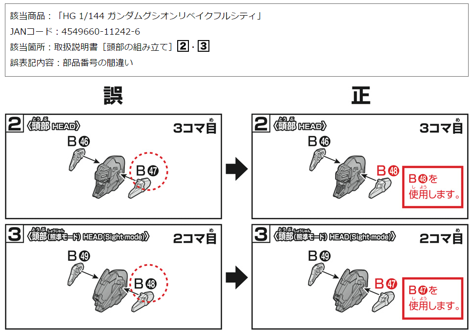 「取扱説明書」通りに作ると顔が” 左右非対称 ”になるという報告が「twitter」「2ちゃんねる」で少しあり、作り慣れていると番号を見ずに形で作るので話題にはなりませんでしたが、店頭に貼り出される事態となりました。リベイクは無印に続き「フルシティ 」も不遇ですね。