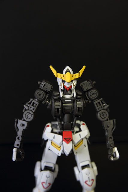 バルバトス第4形体 ヘッド完成 「バルバトス」はガンダム顔というイメージが無かったのですが、プラモだとガンダムをしていますね。小顔で有りながら細部まで作り込まれており、かなり良いです。 ![]() バルバトス第4形体 ボディ完成 装甲は前面しか無く、フレームに直接バックパックを差し込みます。蓋は簡単に取れてしまうので無くさないように注意。肩の装甲をまだ付けてませんので、肩位置が分からず上げ過ぎてしまいました。息苦しそうです。 ![]() バルバトス第4形体 アーム完成 「バルバトス」のシール(マーク)は、メタリックピンクの「C」型の中に「I」型を貼るので全体的に難しいのですが、肩の「C」型はかなり大きく「○」型に近いので特に難しいです。アニメでは「バルバトス」のデザインが好きではありませんでしたが、プラモは格好いいですね。