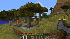大きさは日当たりなどの環境でも無くランダムの様に感じます。入手しやすい「オーク(樫)」「アカシア」「シラカバ(白樺)」の中で、「アカシア」が最も大きくなりますので、木の種類が影響せず消費の激しい「棒」作りには適していますね。「木こりmod」と言う物があるとの事ですが、PARの様なズルはしない方向性で行きます。