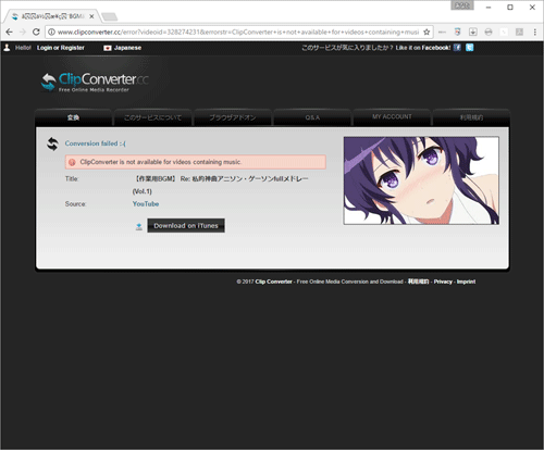 | □ Youtube 音楽情報のあるものは保存不可に 勉強しながら、絵を描きながら、ゲームを作りながら聞くのに適した作業用BGM。とても気に入った物がありましたので消える前に保存しようとしたところ、最近Youtubeは音楽情報のある物は保存不可になりました。 × TokyoLoader 1クリックで保存できる簡単なダウンローダ「TokyoLoader」 以前 ニコニコ動画・Youtube・FC2 で確認しましたが、 【TokyoLoader | Chromeの拡張機能でニコ動・YouTube・FC2をワンクリックでダウンロード可能に】 ![]() Youtubeで音楽情報のある物のみ失敗するようになりました。実況プレイは出来ます。 ※ 数ヶ月後HTML5に移行しYoutubeもニコ動も全て不可に ![]() × 動画ゲッター 多くのサイトに対応している「動画ゲッター」 「Google Chrome」のアドオンでサイト内を解析し動画一覧を取得 その中で目的の動画と思われる物をダウンロードします。 以前はYoutubeでも使えたのですが、情報を取得できなくなりました。 ![]() × YouTube変換 - ClipConverter.cc そこでYoutubeがダウンロード出来ない場合にどうすれば良いか調べました。 「YouTube変換 - ClipConverter.cc」を使用するのが良いとの事。 ブラウザでURLを入力じ「続行」をクリックするだけで、 そのままダウンロードか好みの動画・音楽形式を選べます。 ![]() サムネイルは表示されますが ClipConverter is not available for videos containing music. ClipConverterは、音楽を含むビデオには使用できません。 とエラーが表示されます。これで気が付きました。 Youtubeは今まで簡単に全ての動画をダウンロード出来ましたが、音楽関連の著作権がある動画はダウンロード不可に方針を変えたようです ![]() □ YouTube動画変換 -ONLINE VIDEO CONVERTER 使い方 作業用BGMをダウンロード出来るダウンローダは無いか探したところ1個発見しました。 ![]() YouTube動画変換 - MP3、MP4、AVIダウンロード https://www.onlinevideoconverter.com/ja/video-converter 最近流行のブラウザタイプです。URLをコピペして形式を選びます。 音楽としてDLするにはmp3、動画としてDLするにはmp4など14種類から好みで選択可能。 ![]() 「スタート」をクリックし相手サーバ上で変換がされます。 変換が終わると「ダウンロードする」「もう一度変換する」から選べます。 ![]() Youtube現在の方式に対応していることを確認しました。広告が多く突然飛ばされたりするのが欠点です。セキュリティソフトは必ず入れておきましょう。以前のYoutubeは殆どのダウンローダに対応しており、ご自由にDLして下さいと言うスタンスでしたが、突然厳しくなったようです。 これは Adobe Flash が廃止となりますのでHTML5に移行した為と思われます (記載:2017年5月30日) |