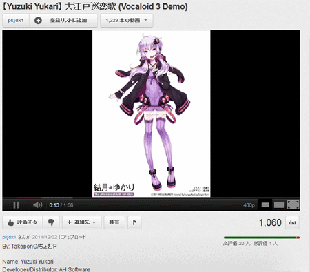 | サンプル どのような歌声なのかが気になります。Youtuben方にサンプルが上がっているようです。聞いてみると声が低く見た目より年が上に感じます。歌は滑らかですね。 ![]() 【Yuzuki Yukari】 大江戸巡恋歌 (Vocaloid 3 Demo) http://www.youtube.com/watch?v=Vju8tMLCC4Q&feature=player_embedded ![]() 【Yuzuki Yukari】 月と猫とバイオリン (Vocaloid 3 Demo) http://www.youtube.com/watch?v=YLKLi30yb-o&feature=player_embedded ![]() 【Yuzuki Yukari】Behind My Daisy(beatless ver.)【Demo】 http://www.youtube.com/watch?v=HYmKAO6h80U&feature=player_embedded