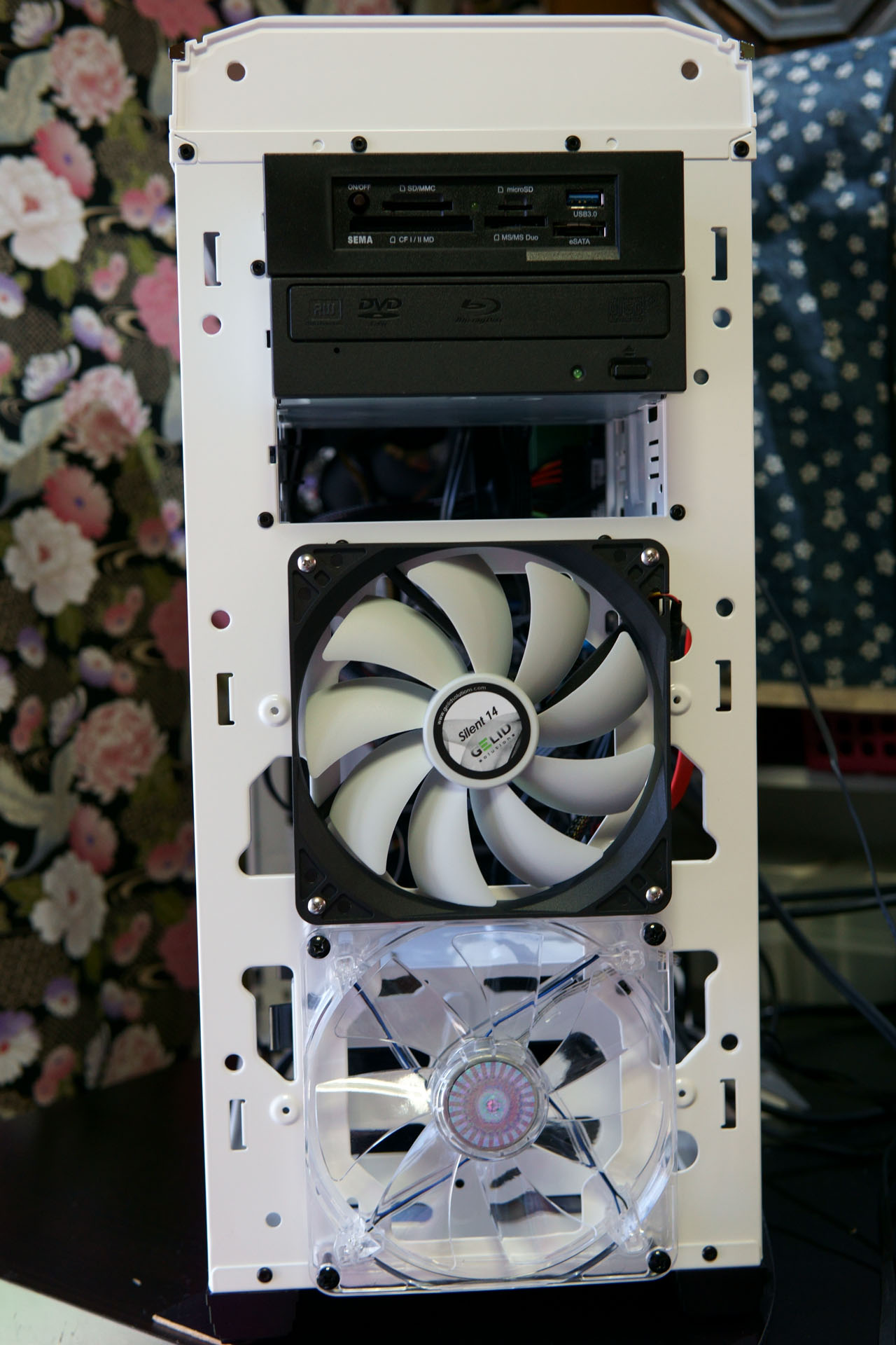 □ 高級感は上がったが見えない部分でコストカット COOLER MASTER CM 690 III White開封 昨年夏に組んだ叔父のPCではCOOLER MASTER「CM 690 III CMS-693-KKN1-JP(ブラック) ![]() 横が透明アクリルに ブラックは横が網でしたが高い透明アクリルを使用。左に置くので見えないんですけどね ![]() ホワイトはコストカットでネジが付いてこない 全体がホワイトで塗装され透明アクリル使用と原価が高いのにブラックと同じ価格。代わりに真ん中のシャドウベイが無くされています。これは購入前に気が付きグラボの邪魔になるので良しとしますが、まさかネジが付いてこないとは…。ブラックはシャドウベイの中にHDDサイズの段ボール箱が入っており、大量のネジが詰まっていましたが、ホワイトは小袋に少量しか無く明らかに足りません。 ※ 画像中心の袋 ![]() □ ケースファン専用ネジが付属しない酷さ フロントのケースファンが1個しか付いてこないので、定番の「GELID ケースファン 14cm SILENT14 困ったのがファンに付いてきたのは「防振ゴムブッシュ」、ケースにはネジ付属せず…食わず嫌いもいけないので試すことに。 ![]() しかしケース側が未対応で断念 ![]() 専用ネジで注文も出来ないとAmazonレビューでも不評 フロントファンを止めるには特殊ネジが必要で最初から付いているファンのネジを外して見ましたが、先端5mmはM3のネジで残り25mmはつるつるのM4という構造で厄介です。初期はケースファンが2個しか付属せず最大5個まで増やせるのを売りにしておいて専用ネジが無く増設できないとは…ここはコストカットしては駄目でしょう!! ![]() 代用品 そこでAmazonのレビューを読むと当方だけでは無く皆さん困っており 「ホームセンターで売っているナベ3×30を4本と3ミリ平ワッシャを4枚で代用可能」 との事で翌日買ってきました。 他のネジが全て黒なので合わせたかったのですが売っておらず断念 本来の物より途中が細いので隙間は出来ますが、4箇所しっかり固定すれば動きません ![]() 何とかファンを取り付けましたが最初から付いてくるケースファン(下)は何か光りそうですね 続いて「内蔵型カードリーダ」と旧PCから取り外した「pioneer BDR-207D」を設置 ![]() ![]() フロントパネルのフィルタ フィルタはフロントパネルの裏に付いているので掃除の時は取り外す必要あり、フロントパネルを外すには左右を外す必要があるので面倒です。掃除が厄介なのでティッシュを剥がし薄く1枚にし貼り付けました
