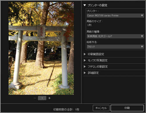 | □ 試し印刷を行う 前回「無線LAN」と接続し最新の「ソフトウェア」をインストール。セットアップが完了致しましたので、今回はテストプリントをして行きます。 ![]() 最高の写真用紙(サンプル品) プリンタには用紙を買って貰うために、写真用の「お試しパック」が基本付属しています。箱の中を探したところありました。「キャノン写真用紙・光沢 ゴールド」という高級品です。 ![]() 一眼レフの写真を使う こんな高くて良い紙は常時使うことは出来ないと思いつつ、試し印刷する事に致しました。「PIXUS MG7130」の最大スペックを見る為、先日撮りに行った紅葉の写真の中で一番良い物を選び、最高品質で印刷します。今回使用する写真はこちらとなります。 ![]() カメラ:CANON EOS Kiss X5 レンズ:SIGMA 17-50mm F2.8 EX DC OS HSM [Canon用] 撮影日:2014年11月 □ 余白が大きくなってしまう不具合 開封口を止めてあるセロハンテープは危険 いつも思うのですが、開封口を「セロハンテープ」で塞ぐのは止めて欲しい。 気を付けていても、用紙を取り出すさいに付いてしまい使えなくなります。 ![]() デジカメの用紙サイズは大きい 1枚目は「セロハンテープ」で駄目にしてしまいましたが、使い慣れている画像加工ソフトで以下の様に設定し印刷致しました。しかし拡大された一部分だけ印刷され失敗。
