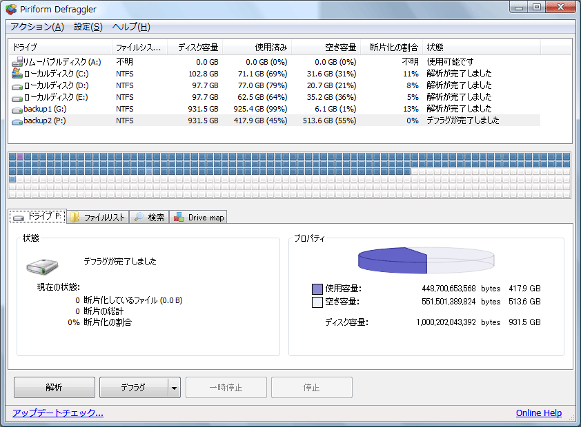![]() Defraggler - File and Disk Defragmentation - Free Download http://www.piriform.com/defraggler 断片化ファイル一覧を閲覧し断片化しているファイルのみデフラグをかけることや、Windowsのデフラグツールと置き換えることが可能で使い勝手がいいです。見た目で断片化している状態が分かり、データも表示され初心者でも分かり易いです。 ![]() ![]() 簡単起動 OSのデフラグツールと置き換えていれば ドライブを右クリックし[ツール]→[最適化]→[最適化する]で起動できます。 ![]() タイムスケジュールを外す 「Defraggle」の場合 [スケジュール]→[選択されたボリュームのデフラグをスケジュール]のチェックを外しておきましょう。デフラグはSSDをクラッシュさせ、頻繁なデフラグはHDDの寿命を縮めます。 ![]() |