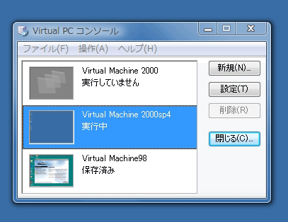 | □ 基本操作 マウスのウインドウの外に出す 最初にマウスが外に出せなくなり慌てるかと思います。 Virtual PC 2007内でクリックすると小ウインドウ内にマウスアイコンが入り込みます。 そしてウインドウの外にマウスが出せなくなりますが、右側の[Alt]を押すと出せるようになります。左側のでは駄目です。 Windows2000のログイン ログインする為にIDとパスワードを入力しなければなりません。 しかし[Ctrl+Alt+Del]を押すとVistaのタスクマネ-ジャが立ち上がってしまいログインできません。ここでも躓きますが、メニューバーの[操作]の中に[Ctrl+Alt+Del]が用意されております。 ![]() ドライバなどは必要無し 驚いたのが、音源やグラフィックカードのドライバも必要無しで架空の物に自動で置き換えてくれているようです。そしてUSBのマウスやキーボードも動きます。 Vista上の物を自動で変換してくれているようです。 凄いですね。 画面サイズも普通に架空OS上で変えられますが、所詮エミュレータなので大きくすると重くなりますので控えめに。 ![]() □ 状態保存 架空OS上で「シャットダウン」もしくは「電源を切る」で落とせますが、ゲームのエミュレータのように「状態を保存する」で、どこでもセーブが出来ます。 このように複数のOS(環境)を「Virtual PC コンソール」で管理でき、とても便利です。 上から[電源が落ちている状態]、[実行中状態]、[状態をセーブし落としてる状態]です。 OSはこれに合わせて別途用意する必要がありますが、要する方は過去に使っていて持っていると思われますので。 ![]() 右下に常駐しますが、重くなりますので使わないときは切りましょう。 ![]() |