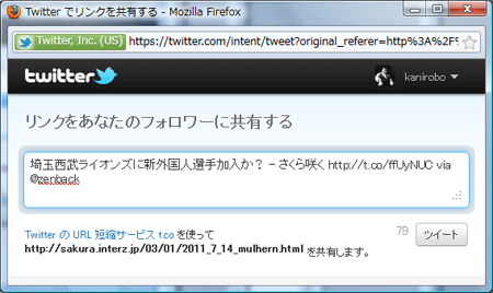 □ 設置完了 動作テストしてみます。反映されるまで数日かかるようです。Tweet数とTwitterでの発言がコメントの様に表示されます。これはURLで判断しているんですよね。 ![]() 発言の仕方 上のTweetアイコンをクリックすると発言できます。簡略URLが使用され、この呟きがコメント欄に反映されます。自分のTwitterのアカウントで呟けるので気軽に誰でもコメント出来るという訳です。難点はデータをMT5側で持てないので管理できないことですかね。 動作条件が" RSS "を発信していることと、エンコードが" UTF-8 "を使用していることです。これらはMT5を使用しているのなら問題無いでしょう。 ![]() (記載:2011年7月21日) |