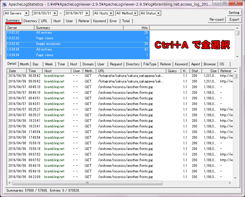□ 呼び出し回数の調べ方 全選択 色々試して見ましたが、「Statistics(統計)」をクリックしても項目が増えるだけで全てを同時に見られる訳ではありません。試行錯誤しましたが、「Summary(概要)」を選択し窓の中で適当に1クリック。その後「Ctrl + A」で全選択します。ログが多いほど時間が掛かります。アクセス数の多いサイトはログの日数を少なくしないと危険です。 ![]() 転送量は表示できず 検索キーワードやリンク元など細かいデータを調べることが可能ですが、当方の知りたい「転送量」は見付からず。「Request(要求)」をクリックすれば呼び出し回数が見られます。これで異常な数値を出しているファイルを調べることは可能でです。 ![]() 転送量を調べられず シックスコアの転送量は「50GB/日」なのですが、何故かサーバに搭載されている解析には上限があり途中で止まってしまいます。サーバから警告が来るまで分からないので自分で調整したかったのですが、これでは分かりませんね。 (記載:2016年4月7日) |