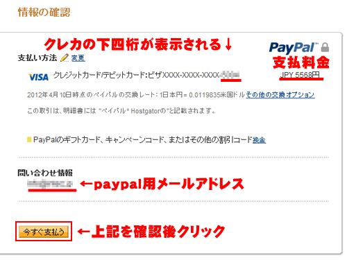 | 再度paypalを選ぶ 支払方法で「paypal」を選択しましたが、ここでもpaypalかクレジットカードかを聞いてきます。クレジットカードは、悪用してないかの本人確認が面倒なので「paypal」のままにします。左側には支払明細が出ています。$66.7ですので、$1=82円計算で1年5,469円と破格の安さです。 ![]() paypalにログイン 先ほど作成した「paypal」アカウントにログイン致します。paypay用のメールアドレスとパスワードを入力しログインをクリックします。アカウントを持っていない場合はゲストでも使えますが、登録無料ですのでゲストを使わず正式に登録しましょう。「HostGator」の支払でゲストを使った場合は、クレジットカード同様に本人確認が必要となり面倒なことになります。銀行口座の追加されている「paypal」を使用しましょう。 ![]() クレジットカード引き落とし 日本から「paypal」への入金は出来ませんのでクレジット払い決済になります。 「クレジット → paypal → HostGator」と遠回りになりますが、こうしないと身分証を送付することになります。クレジットカードの下四桁が表示されますので、合っているか確認。支払料金とpaypal口座のメールアドレスも確認します。間違いがなければ「今すぐ支払う」をクリック。 ![]() 手続きででクレジットカードの上限が外せる 注文後にpaypayからはメールは来ませんでした。来たのはクレジットカード登録メールのみでした。後日確認書類が送られて来ます。その手続をするとクレジットカードの利用上限が外れるとの事ですが、それはそれで怖いので上限有りのまま使いたいと思います。 ![]() |