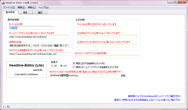 ![]() RSSエディタ Headline-Editor Lite版 http://www.infomaker.jp/editorlite/ ver0.93 RSSファイルを作成するフリーソフトです。使い易く管理も簡単です。