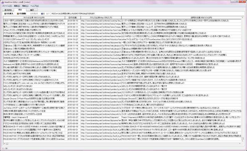 □ 項目 サイトマップではなく「サイトの更新情報」を記載していきます。RSSには新しい物から15件までしか表示されませんので、無理して過去の更新を全部記載しなくても、新たな更新の度に記載していく形で十分だと思います。ややソフトが重く使い勝手がExcelに近いですね。 タイトル(必需 100バイト以内) サイトのタイトルではなく更新した記事のタイトルです 日付(任意) 更新日付はあった方が良いので記載しましょう。過去の記事で分からない場合は大体でいいと思います アドレス(必需) 更新した記事のURLです。URLはhttp://から入力します。 説明文(任意 400バイト以内) 任意ですが、これも記載した方が効果的です。内容が分からない記事は怖くてURLを踏む気にはなりません