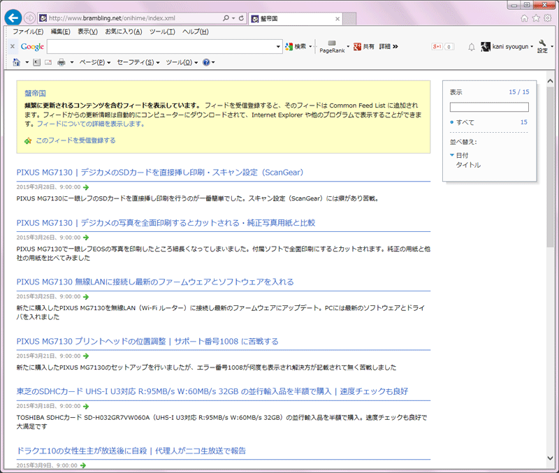 □ 確認 確認でソースを見られます ![]() □ 保存 書き出しという項目が無く、保存で設定ファイルとRSSファイル両方が保存されます。「.tbl」は設定ファイルで「.xml」がRSSファイルとなります。保存名をサイト名にするとRSSが「サイト名.xml」となってしまい、「index.xml」に直さなければなりません。逆にindexで保存すると設定ファイルが「index.tbl」となってしまい何のサイトだか分からず不便ですので、サイト数分「RSSエディタ Headline-Editor Lite版」を用意致しました。 □ 開く 「headlineedlite.exe」をダブルクリックし起動すると、最後に使用した設定ファイル「.tbl」が開かれ続きから作業できます。「ファイル」→「開く」で他の「.tbl」を指定すれば他のRSSも編集出来ます。ただし、いくつものサイトを運営している場合はファイル名を変えないと上書きしてしまうので不便です。RSSと設定ファイルを別々で管理できれば助かったのですが。 □ RSSへのリンクを貼る トップディレクトリに「index.xml」を置き、リンクタグでリンクするだけです。特殊なタグはいりません。RSSの文字だけでは寂しいので、無料配布されているRSSのアイコンを借りても面白いです。私は自作でドット打ちしてみました。 ![]() □ 購読ページ RSSのリンクをクリックしよく目にする購読ページが表示されるか確認してみましょう。 Google Chrome 使用人口が高く今一番人気の「Google Chrome」ですが、サイト作成者には使い難くRSSも表示されません。 ![]() Firefox プラグインが豊富な「Firefox」は購読ページが表示されます。一時期人気ががあったがFlashに弱く重い欠点がある。サイト作成には使い易い。 ![]() Internet Explorer とても重く通常は使っていないが、デフォルトのブラウザだけあって初心者向けで全てのプラグインに対応しており、「Google Chrome」と「Firefox」非対応のアプリ対策で使っています。購読ページも見易い。 ![]() □ 編集後記 利点 2年ほど使っています。現在「アンテナ」に2箇所登録していますが、中小規模の「アンテナ」でも1回のRSSの配信で600~1000アクセスあります。Googleからも1時間程でアクセスが有りとても美味しいです。 ![]() PSO2ブログ巡回屋 http://pso2.waraou.net/ ![]() みんなのPSO2 http://pso2antenna.blog.jp/ □ 欠点 文字化け HTMLエディタからコピペすると文字コードが違うらしく文字化けするので、FTPでアップした後にブラウザからコピペしなければならない。 ![]() 日付設定がバグっている日付設定がバグっており当日以外はカレンダーから選べず手打ちとなる。 投稿時間の設定が出来ない 投稿時間が強制的に朝の9時に設定されます。これ自体は構わないのですが、登録している「アンテナ」が、未来の投稿になると拒否され表示されません。そこで「テキストエディタ」で開き、最新の日付部分のみ手打ちしています。 最終更新日のみ時間が記載されますので、「2015-03-28T17:51:35+09:00」の時間部分「T17:51:35+09:00」をコピーし最新記事の日付の後にペーストします。 ![]() 欠点も多いですが、慣れればカバーできますので2年間愛用しております。 (記載:2011年7月19日/追記:2015年4月6日) |