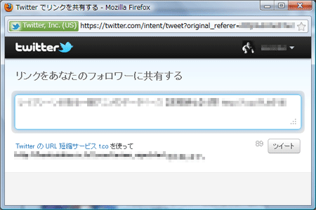 「ツイートする」をクリックすると小ウインドウが立ち上がり呟けます。これは自分のTwitterのアカウント画面になりますので、ログインしている必要がありサイトののタイトルと短縮URLが表示されます。